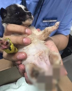 Ses pattes arrières avaient été presque entièrement sectionnées à la suite d'un accident, ou d'un terrible acte de cruauté.Le chiot était en train de ramper sur le bord de la route quand il a été recueilli par un bénévole de l'associationQiming Small Animal Protection Group. Fu Rui a été emmené en urgence à la clinique de l'association pour y recevoir des soins extrêmement urgents.Tong Tong, un porte-parole de l'association, a décrit l'état du chiot à son arrivée :
