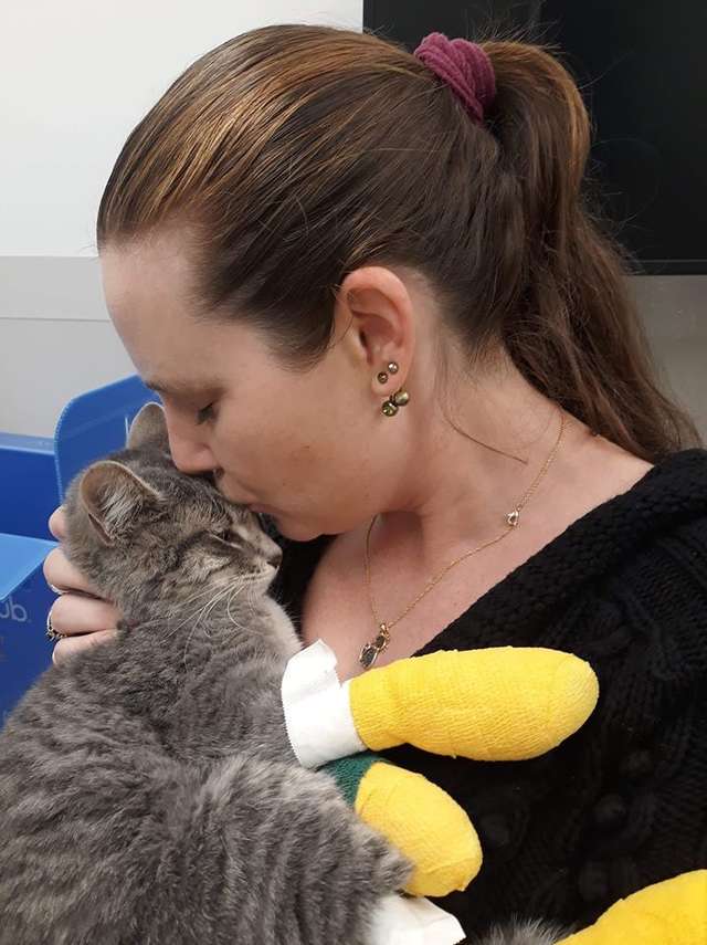 Laci a aussitôt contacté la clinique, avant de s'y rendre avec son mari. Mayson les y attendait. Le chat souffrait de quelques blessures aux pattes. Il s'est aussitôt blotti contre son humain lorsqu'il l'a reconnue.